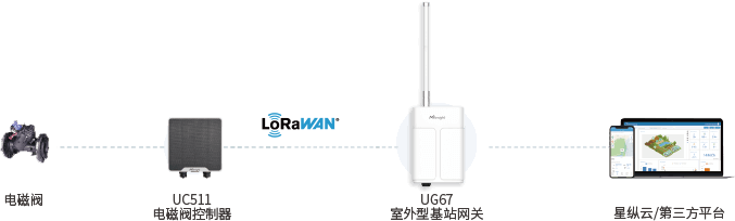 UG67室外型基站网关以抱杆的形式安装,通过太阳能供电,4G SIM卡上网。电磁阀控制器采集的数据通过LoRaWAN®无线传输方式发送到网关,网关再通过MQTT协议对接到高效节水灌溉平台,在平台上可以控制和监测田间阀门的状态。