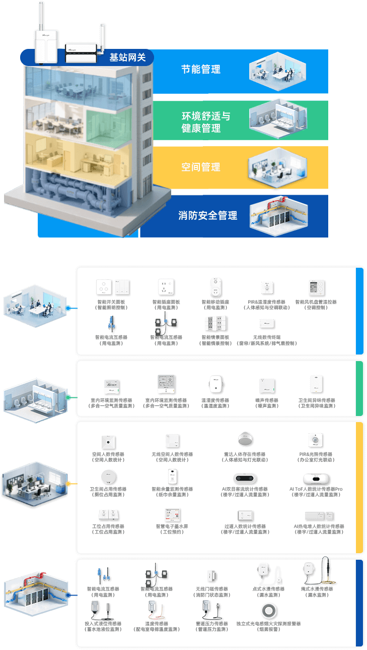 结合市场需求与成功项目应用,星纵物联整合了一套智慧楼宇/智慧建筑产品解决方案,围绕节能管理、环境舒适与健康管理、空间管理、消防安全管理四个维度,为客户构建一体化、可持续的智慧楼宇/建筑运营体系。帮助业主在提升舒适度与安全性的同时,降低能耗与运营成本,以数据驱动楼宇绿色、高效、可持续发展。