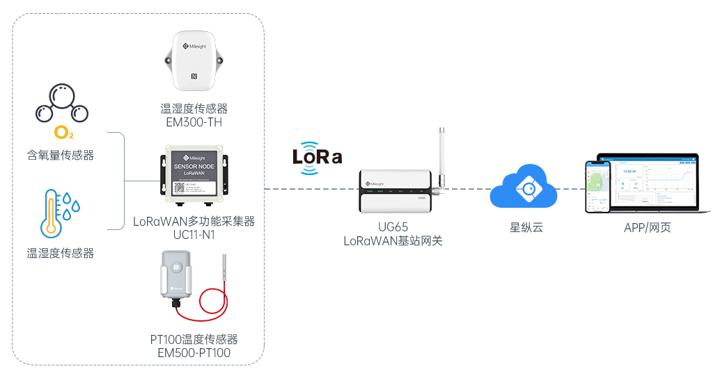 - 空气含氧量对于茶叶的发酵与干燥过程至关重要。本方案中,含氧量传感器与温湿度传感器通过RS485与UC11-N1 LoRaWAN多功能数据采集器对接,UC11-N1采用Modbus协议主动采集传感器数据后,再将数据通过LoRa发送给UG65 LoRaWAN网关,最后,网关会将数据转发到星纵云进行数据分析,判断当下的环境温度和含氧量是否适宜,当相关参数超过阈值时,立即告警,及时作出应对策略。