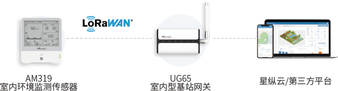 UG65安装在生产车间内,实现整个工厂生产车间LoRaWAN®信号全覆盖。传感器采集的数据通过LoRaWAN®无线传输方式传到网关,网关通过MQTT协议对接到第三方数据管理平台。