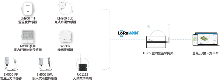 以上传感器数据均通过LoRaWAN®无线传输方式将数据对接到UG65网关,网关通过4G上网,通过MQTT协议对接到控制平台。