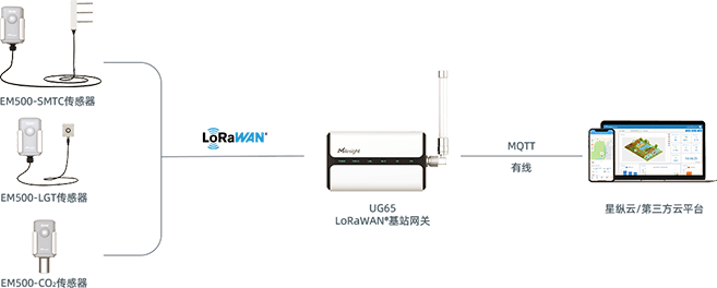 项目中,通过基于LoRaWAN®的星纵物联EM500-SMTC土壤水分温度电导率传感器监测土壤中的水分、温度和电导率等参数;同时通过基于LoRaWAN®的星纵物联EM500-LGT光照传感器和EM500-CO2二氧化碳传感器(集成CO2、温度、湿度、大气压4种传感器),监测温室大棚里光照情况和空气中二氧化碳、温度、湿度情况。