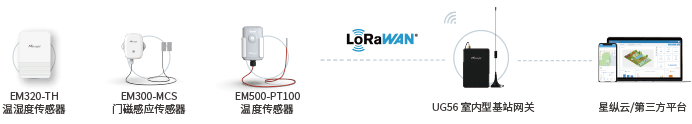 以上设备均通过LoRaWAN®无线传输方式将数据对接到UG56网关,再通过UG56网关内置的网络服务器(NS),以MQTT协议对接到监控平台。