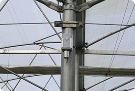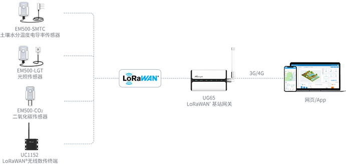 该方案将星纵物联EM500-SMTC土壤水分温度电导率传感器安装在监控杆上,通过传感器5米长的电缆将探头插入土壤中,监测土壤中的水分、温度和电导率情况;同时在杆上安装星纵物联EM500-LGT光照传感器和EM500-CO2二氧化碳传感器(集成CO2、温度、湿度、大气压4种传感器),监测温室大棚里光照情况和空气中二氧化碳、温度、湿度情况。每隔10分钟,传感器将采集到的数据通过星纵物联UG65室内型网关发送到星纵云平台进行分析。当温室大棚内的环境参数超过阈值,通过网关把命令下发给UC1152无线数传终端(DTU),联动开启遮阳或风扇等设备,及时避光和通风。
