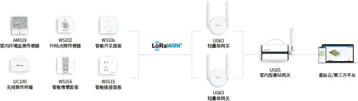 LoRaWAN®信号覆盖:整个银行通过UG65和UG63联合部署,实现LoRaWAN®信号全场景覆盖,现场的传感器和终端均通过LoRaWAN®无线传输方式将数据对接到UG63和UG65网关,再通过UG65网关内置的网络服务器(NS),以MQTT协议对接到银行自己的监控平台。