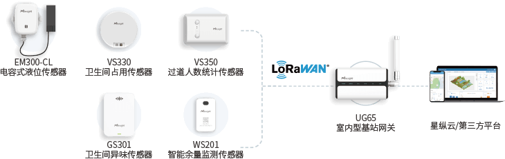 卫生间用品管理:WS201实时监测纸巾余量,不足及时告警补充;EM300-CL 实时监测洗手液余量,不足及时告警补充,避免缺纸缺液的情况。