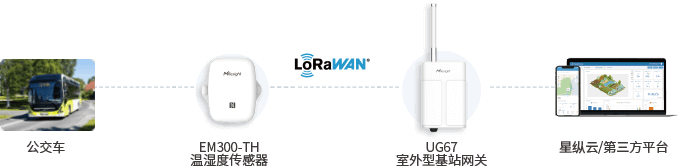 EM300-TH采集的数据通过LoRaWAN®无线传输方式发送到UG67室外型网关,网关再通过MQTT协议的方式对接数据管理平台进行数据分析,便于公交运营公司发现问题并做出优化决策。