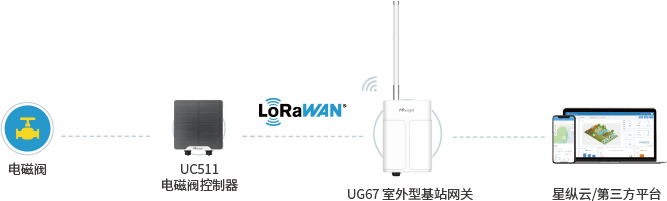 UC511电磁阀控制器以抱杆方式竖装,并通过直连方式与第三方电磁阀对接;电磁阀控制器通过LoRaWAN®无线和UG67网关通信。