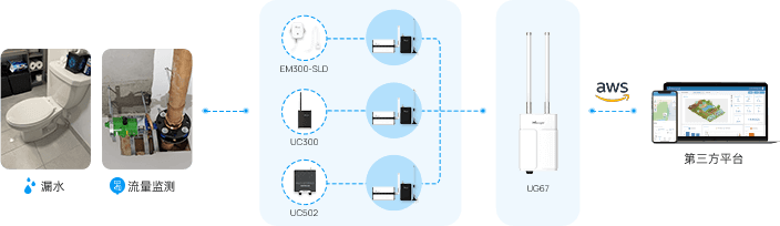 EM300-SLD安装在公寓的浴室、厨房、洗衣房、公共区域和机房。当监测到漏水时,传感器的数据通过LoRaWAN®无线传输方式发送到LoRaWAN®网关,网关通过MQTT协议对接到第三方平台,平台收到漏水告警信息后,下发指令给相应的控制器设备,远程关闭指定的热水或冷水阀。