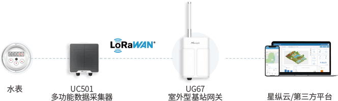 宝洁印度工厂的水表分布在厂区的不同位置。星纵物联UC501多功能数据采集器通过RS485接口与水表对接,可实时采集水表的数据,然后通过LoRaWAN无线传输方式传到UG67室外型网关,网关再通过MQTT协议将数据上传至工厂的数据管理平台。
