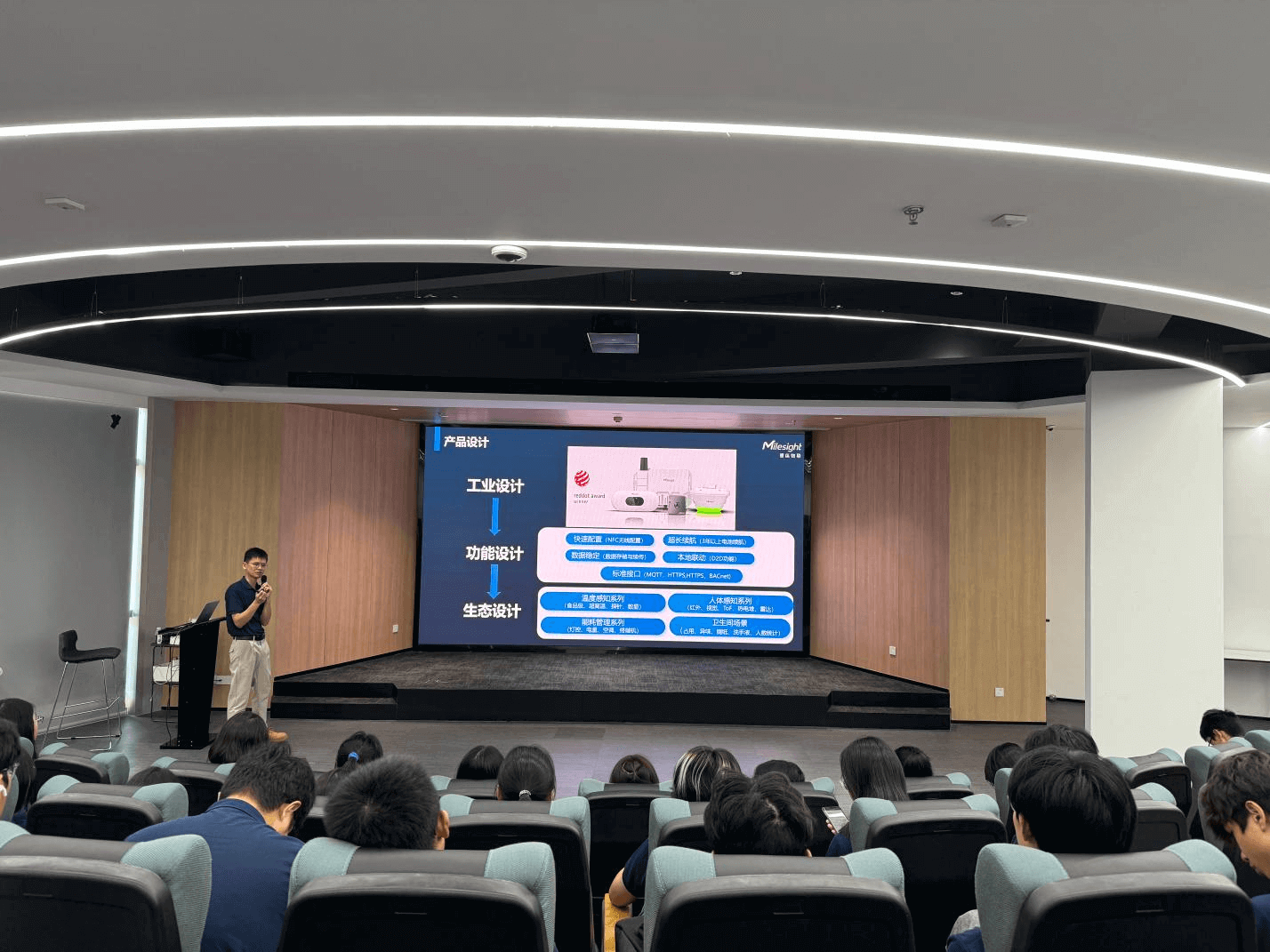 紧接着,星纵物联国内技术负责人王祖粦为参观师生进行《数字感知,赋能数字未来》的讲解,聚焦星纵物联产品在智慧园区、智慧楼宇、办公空间与管理等场景中的运用,如何实现数据的实时采集、传输与联动控制等内容。通过实际新利18登录注册 的剖析,让师生比较清楚了解星纵物联的数字感知产品是如何赋能各行业的数字化转型升级的。