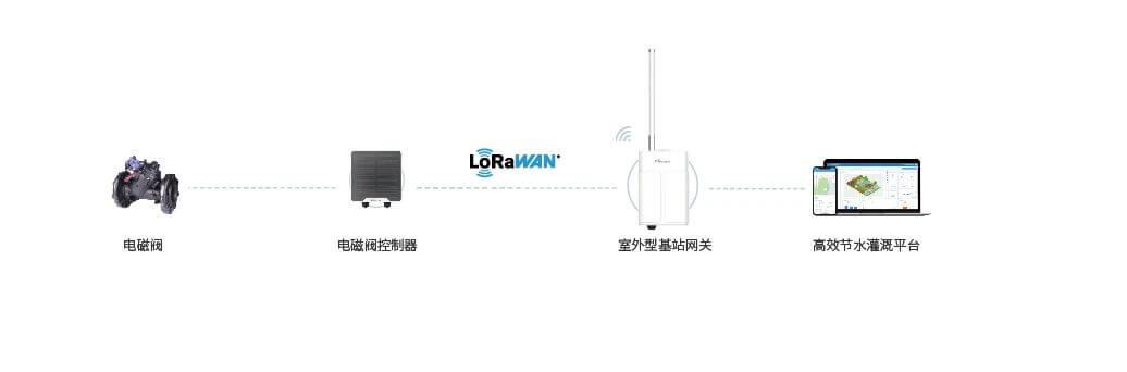 UG67室外型网关:室外型网关以抱杆的形式安装,通过太阳能供电,4G SIM卡上网。电磁阀控制器采集的数据通过LoRaWAN®无线传输方式发送到网关,网关再通过MQTT协议对接到高效节水灌溉平台,在平台上可以控制和监测田间阀门的状态。