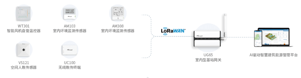 • UG65室内型基站网关:以上传感器和数传终端采集的数据,通过LoRaWAN®无线传输方式将数据发送到UG65,网关通过MQTT和HTTPS协议无线对接到青衍的AI驱动智慧建筑能源管理平台及数据库。