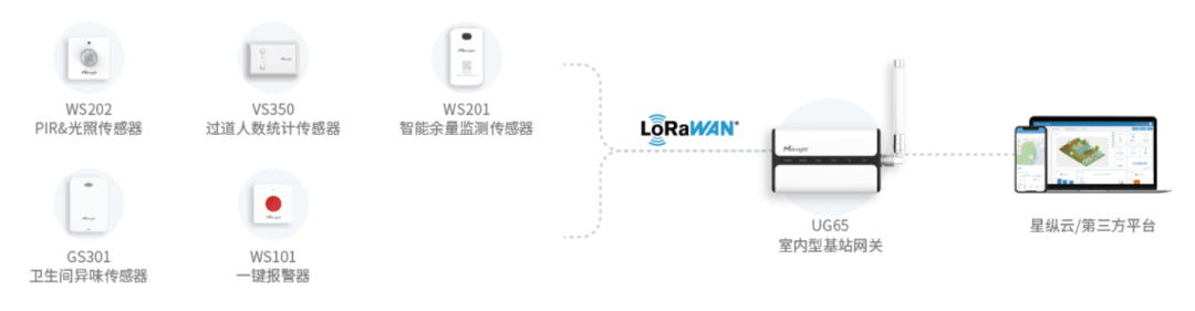UG65实现厕所内LoRaWAN®信号全覆盖。现场的传感器和终端均通过LoRaWAN®无线传输方式将数据传输到网关,网关通过MQTT协议对接到数据监控平台,实现数据的实时监测与集中管理。