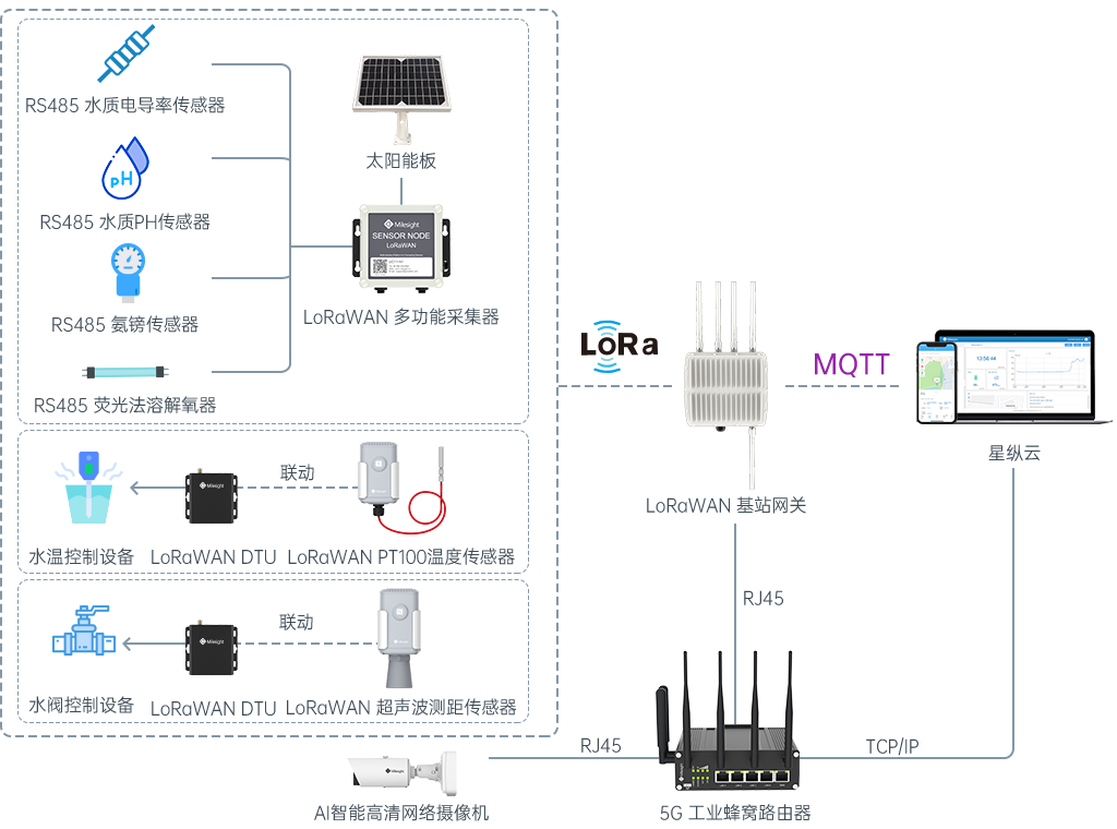 因此,星纵智能为提高水产品的产量和质量,提供了无线远距离传输的LoRaWAN智慧水产养殖监测方案,实时监控水产养殖中的水质和养殖环境安全状况,确保水产品的健康最大化,提高水产品的质量和产量。