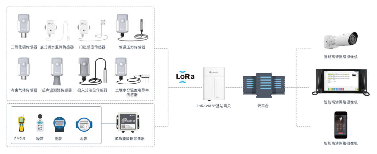 为此,星纵智能提供了LoRaWAN智慧园区联动报警方案,该方案通过传感器、多功能采集器、基站网关、调度台、智能网络摄像机、智能软件(APP)等系列产品,使园区内的环境舒适度、资产安全、安防水平等重要指标得到有效提升,实现智慧园区的数据融合,一体化管理以及智能应用。