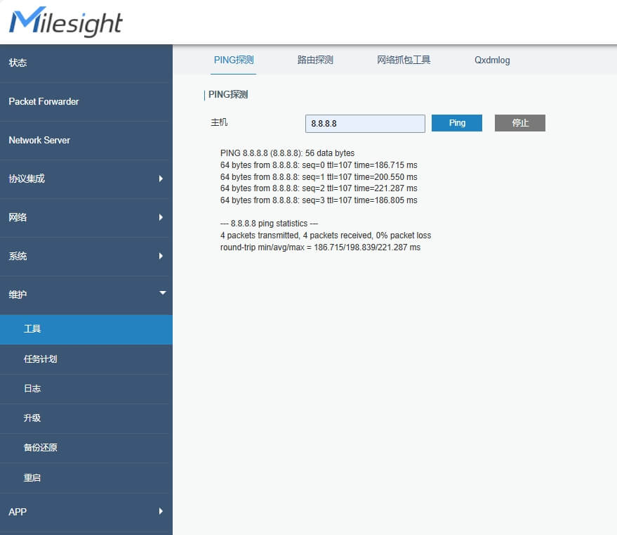 判断网关是否上网的依据是:登录网关界面”维护–>工具–>PING探测”,输入地址8.8.8.8或者114.114.114.114,如果能ping通,说明上网正常。