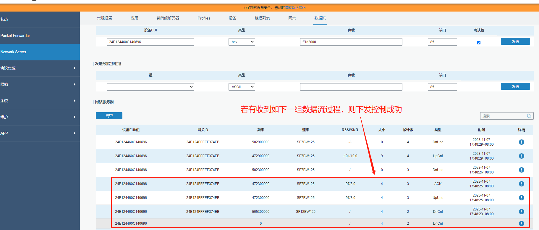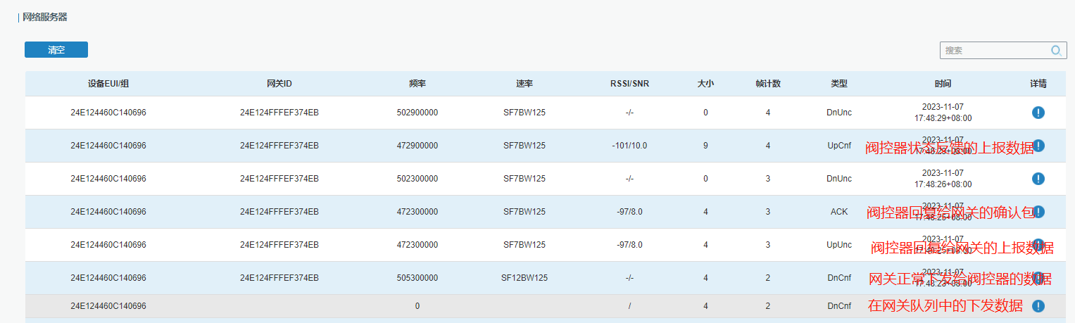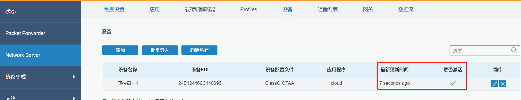 在网关界面,“在Network Server–>设备”,查看”有最新更新时间“和“是否激活已勾选”,则阀控器和网关正常连接。